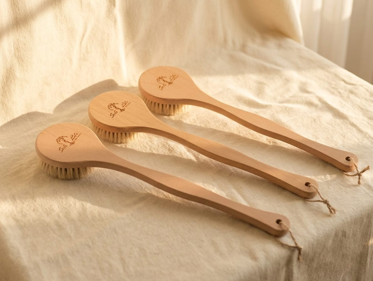 Fırçayı ılık suyla ıslatın ve üzerine Safi Life doğal duş jeli veya sabunu uygulayın.