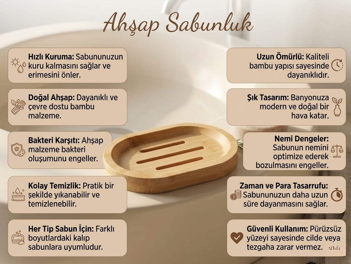 Doğal Hijyen: Bambu, yapısı gereği suya karşı dirençlidir ve doğru bakımla bakteri/küf oluşumuna karşı koruma sağlar.