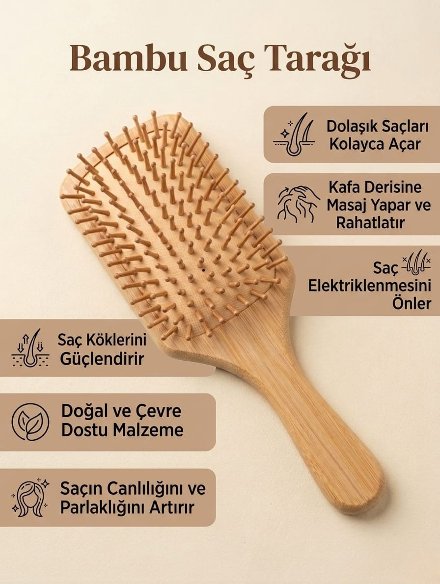 Antistatik (Elektriklenme Karşıtı): Dişlerin de tamamen bambu olması, plastik tarakların aksine statik elektriği iletmez. Bu sayede saçlarınızın kabarmasını önler ve elektriklenmeden şekil almasını sağlar.