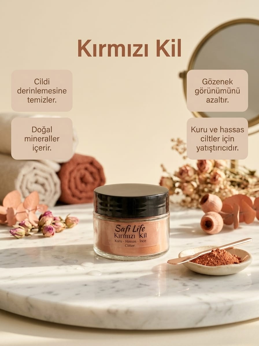 Safi Life Kırmızı Kil, doğadaki en yüksek demir oksit ve mineral oranına sahip kil türlerinden biridir. Cildin altına nüfuz ederek kan dolaşımını tetikler ve yorgun görünen cildi anında canlandırır. Kimyasal işlem görmemiş bu saf mineral deposu, cildinizi kurutmadan gözenekleri arındırırken ipeksi bir doku kazandırır.