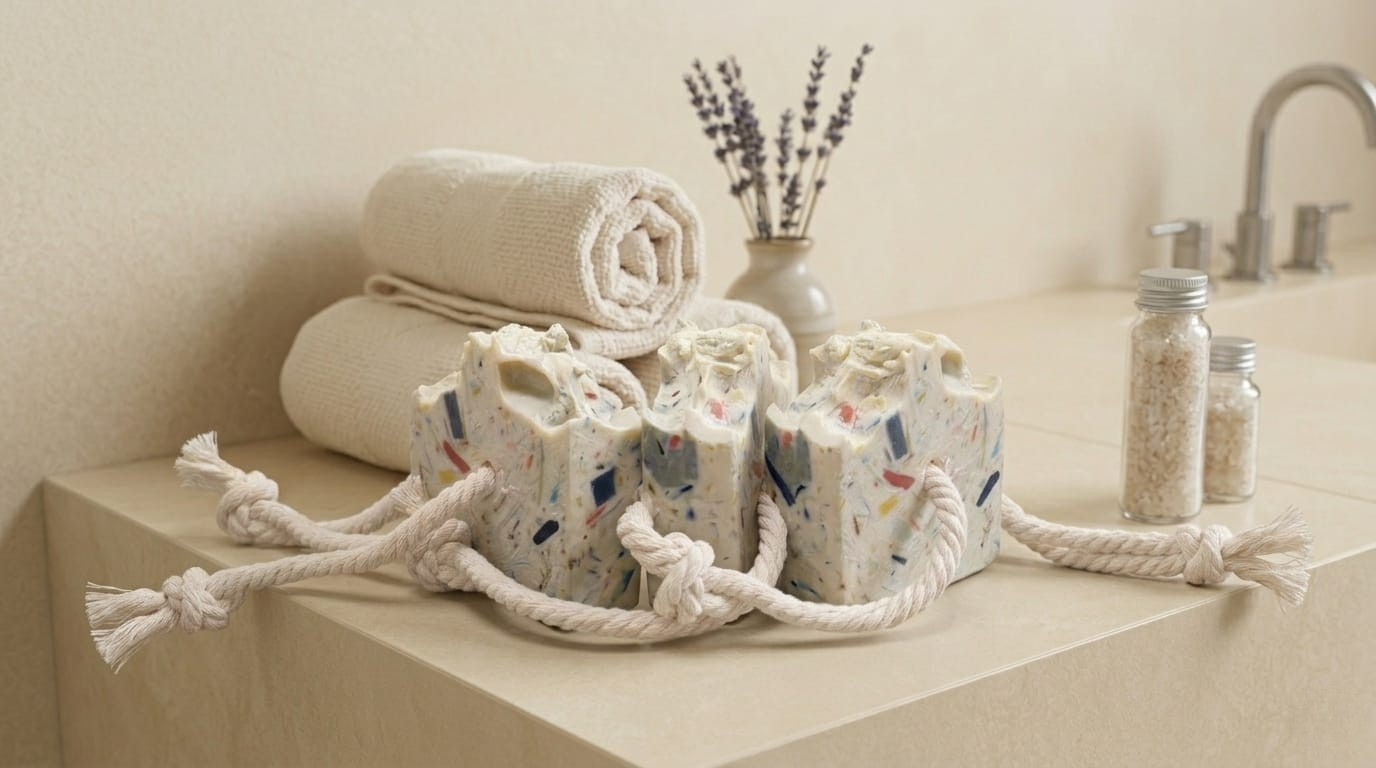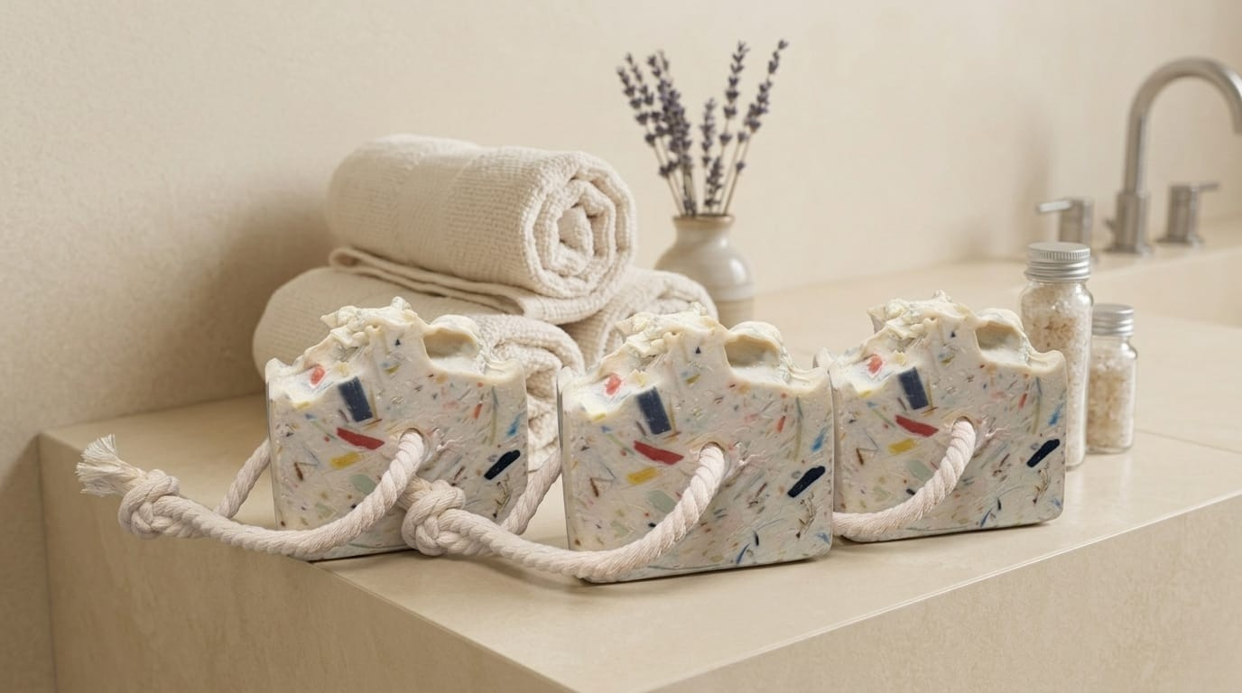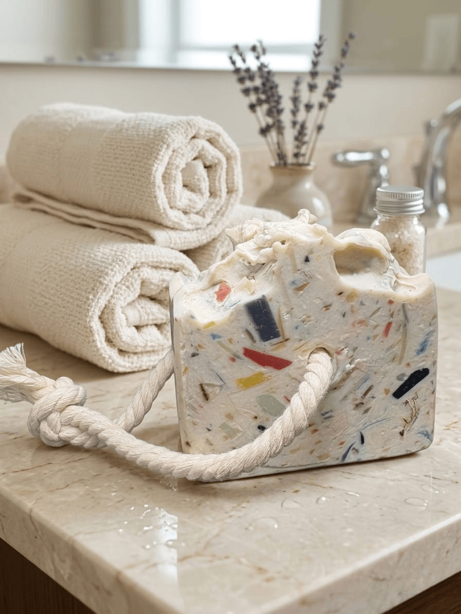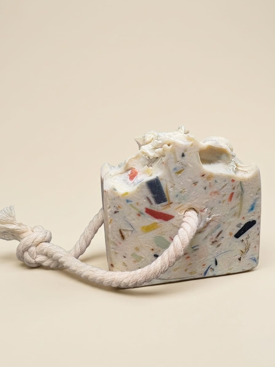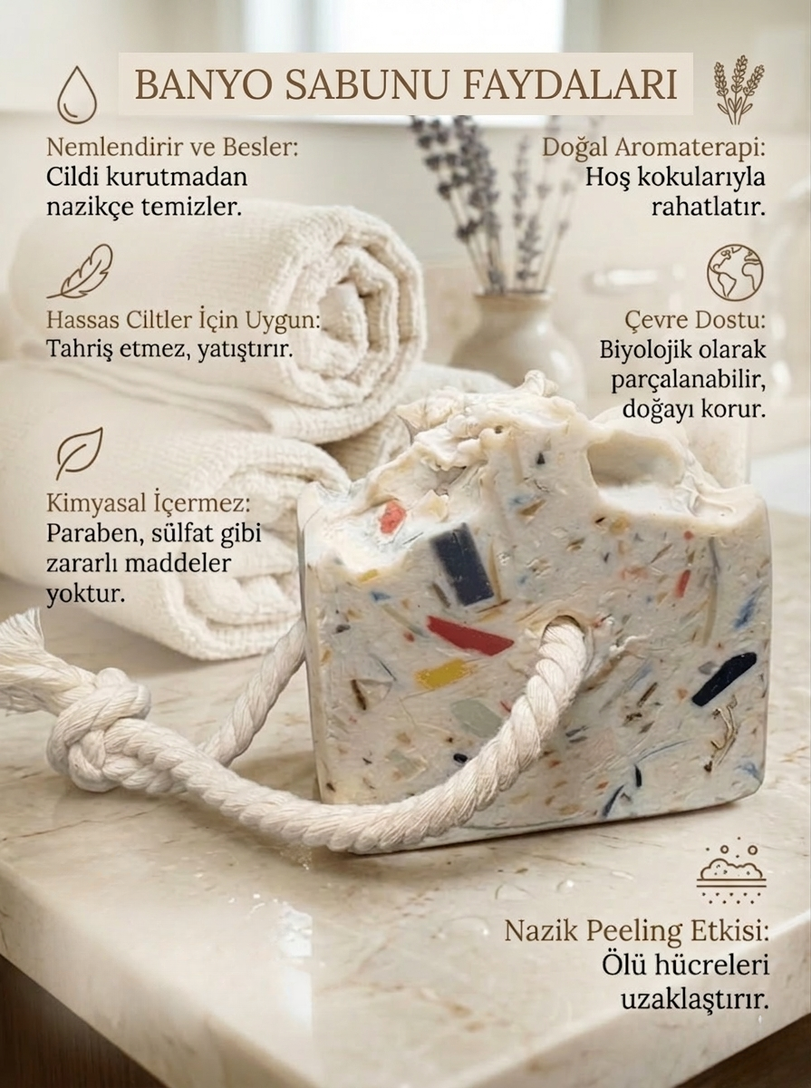 Tasarım: Sabun içine yerleştirilmiş dayanıklı, doğal dokulu askı ipi.