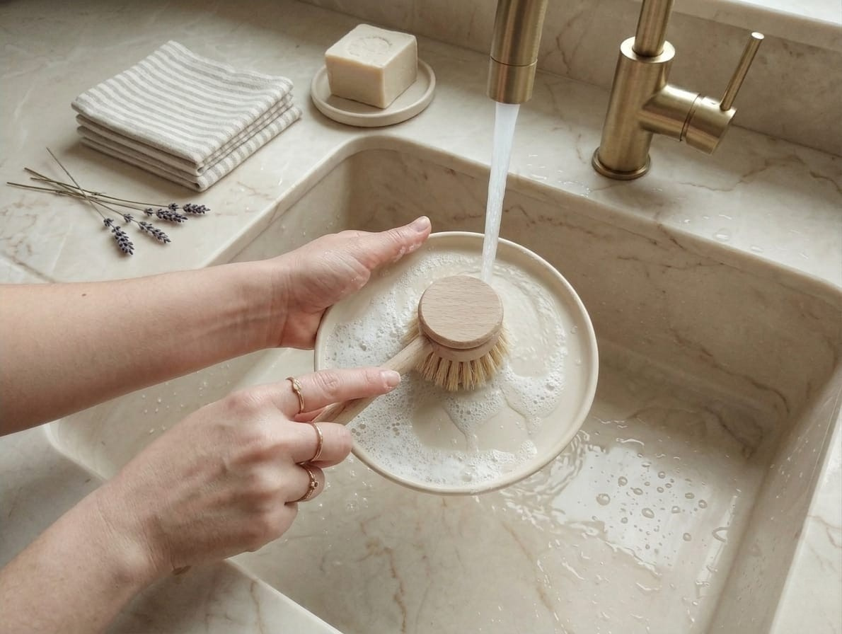 Fırçayı suyla nemlendirin ve üzerine Safi Life doğal bulaşık sabunu veya temizleyici uygulayın.
